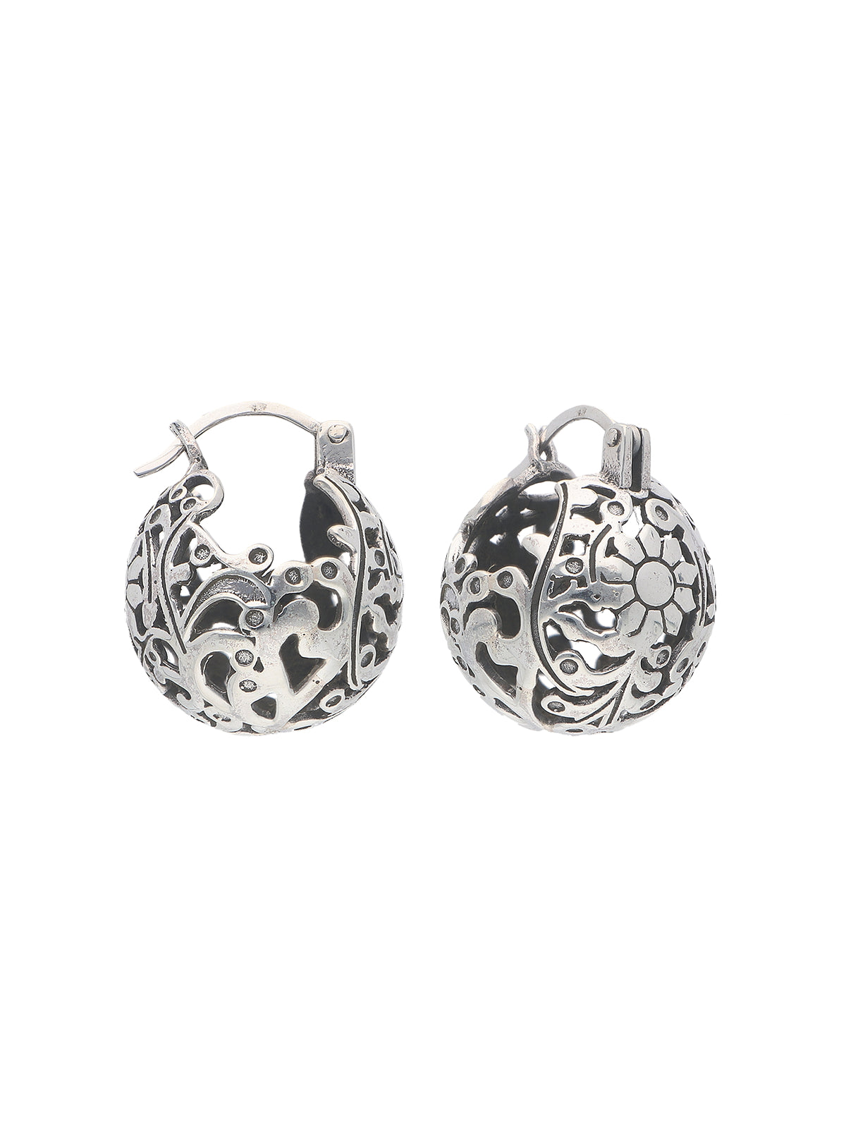 These earrings showcase a bold yet romantic design, intricately carved with an ornate heart motif that is seamlessly integrated into the overall structure. The rich, oxidized silver finish enhances the depth and dimension of the delicate filigree work, with swirling patterns and cutouts creating a lace-like effect. The earrings’ hoop shape adds a timeless element, while the intricacy of the detailing evokes a sense of vintage artistry.